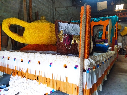 Visite sur plusieurs sites où les chars sont habillés sur mesure selon le thème retenu cette année : les contes.