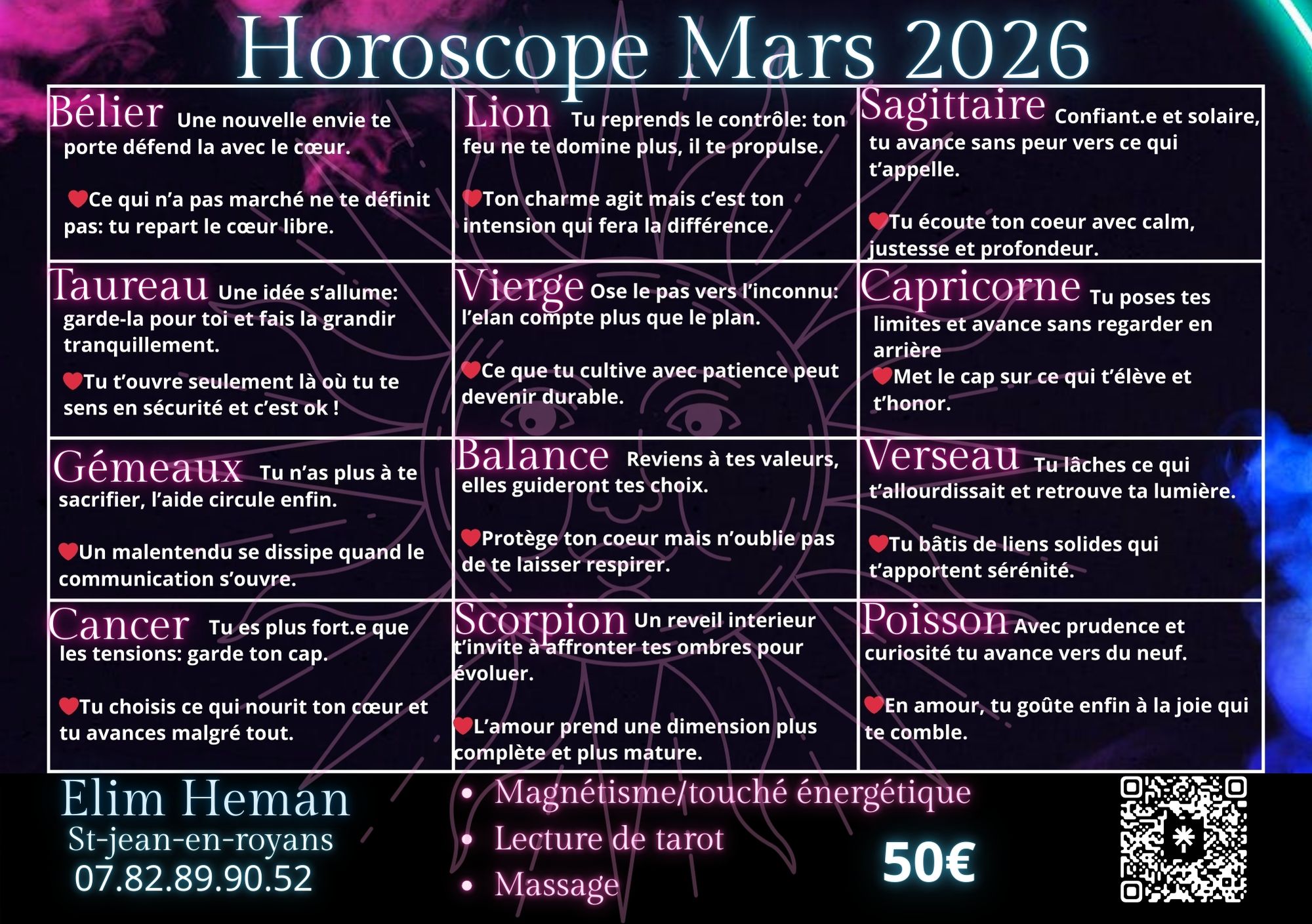 Elim Heman, habitant du Royans est magnétiseur énergéticien, tarologue et praticien en hypnose transpersonnelle® (régressive). Et queer. Il propose des consultations individuelles, des initiations collective au tarot et des tirages mensuel par signes sur sa chaine Youtube, le tarot des queeros. A partir de ce mois de mars 2026, retrouvez son horoscope mensuel sur nos ondes en début du créneau queer de Radio Royans du mercredi 15h.