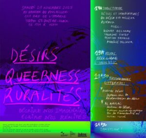 17h00 – table ronde avec WENDY DELORME, LAURINE THIZY et AURÉLIE OLIVIER sur la construction des identités queer et des désirs en milieu rural.