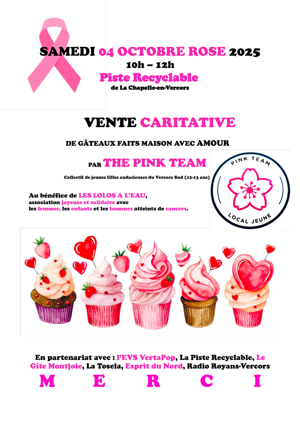 Ana, Lilou, Malou, Thelma et Emmy, ce sont cinq jeunes adolescentes qui habitent le plateau du Vercors et qui ont créé la Pink team. Elles ont souhaité se mobiliser pour Octobre Rose à travers deux actions : une vente de gâteaux caritative et une interview radiophonique. C’est au Local jeune que tout commence, avec l’accompagnement de Fanny, animatrice à Vertapop.