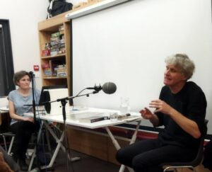 Plateau radiophonique animé en public par Sara, bibliothécaire du réseau des médiathèques en Royans-Vercors.
